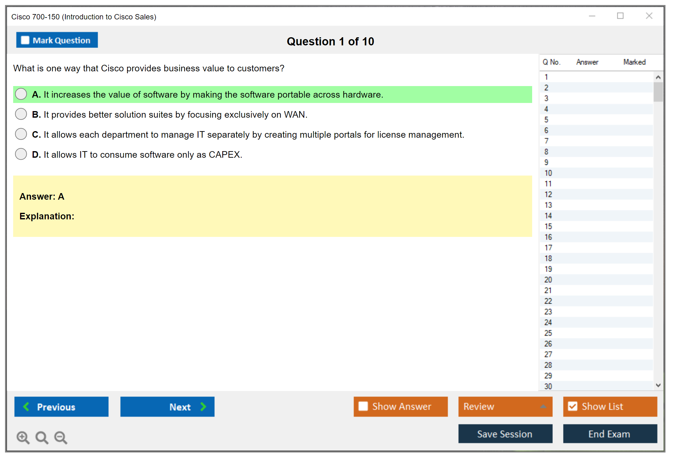 The Cisco 700-150 (Introduction to Cisco Sales) Exam is designed to test the knowledge and skills of sales professionals in understanding and selling Cisco solutions and products. It covers foundational knowledge of Cisco's products, services, and solutions, and their value to customers.