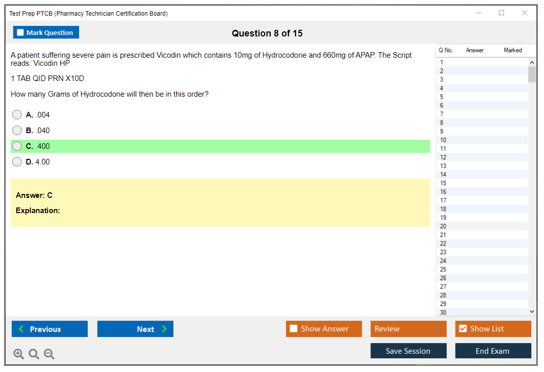 The Test Prep PTCB Exam consists of 90 multiple-choice questions, of which 80 are scored and 10 are unscored pretest questions.